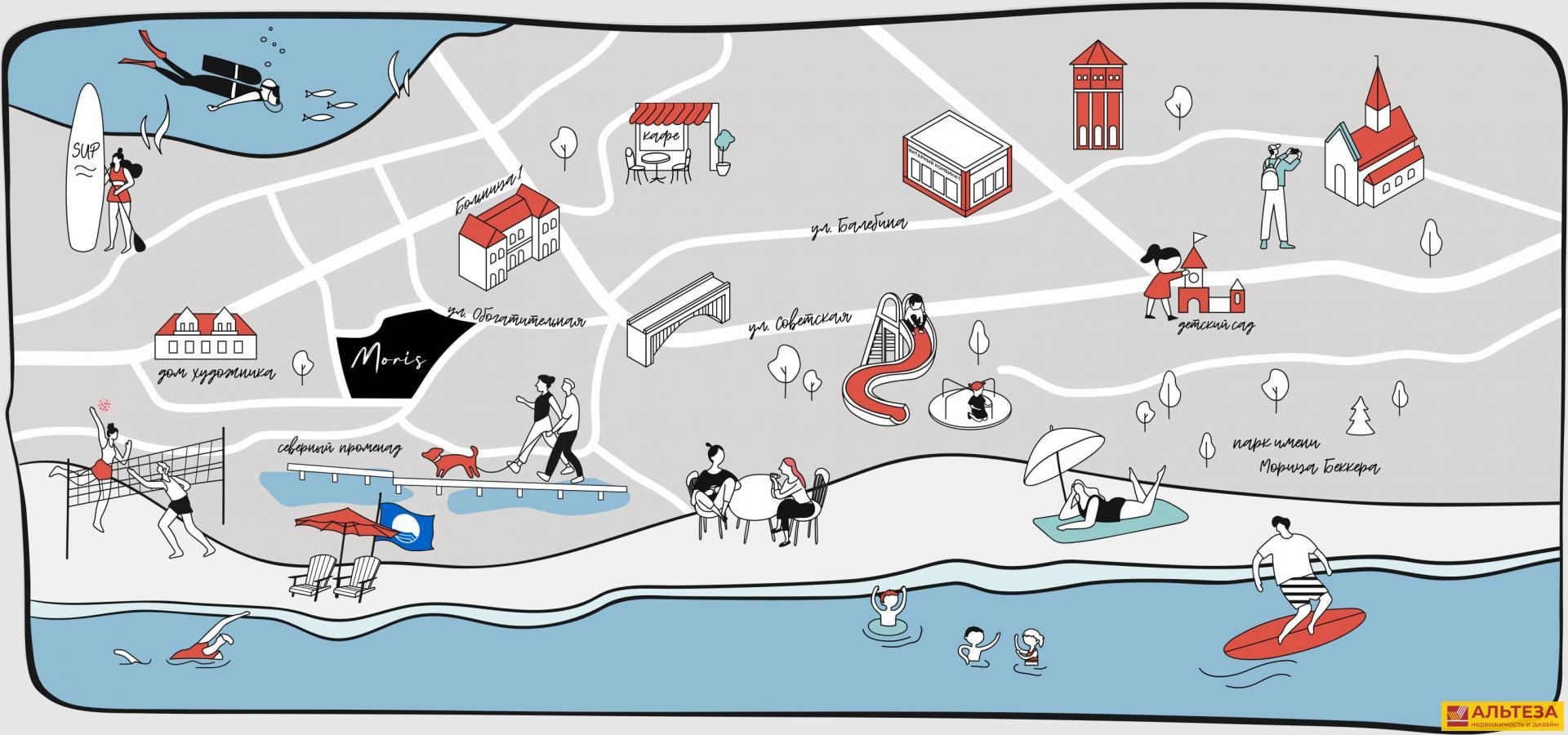 260 метров до моря. 1500 метров до парка имени Мориса Беккера Расстояние до аэропорта и ж/д вокзала Калининграда – 50 км.