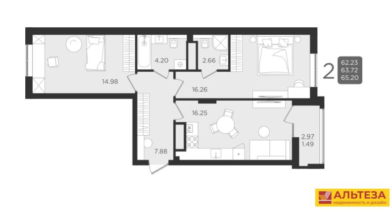 Продается 2 квартира на 6 этаже 9 этажного дома на ул. С. Дадаева. Общая площадь 64,04 м 2, жилая площадь 31,24 м 2 ( 16,26+14,98 ), кухня-гостиная 16,25 м 2 , холл 7,88 м 2, два санузла 4,2 м 2 и 2,66 м 2 , высота потолков 2,7 м, застекленный лоджия 2,97 м 2 ( 1,49 ).