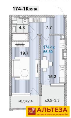 Общая площадь квартиры- 55,3 кв.м., комната-19,7 кв.м., просторная кухня- 15,2 кв.м. Квартира с ремонтом!