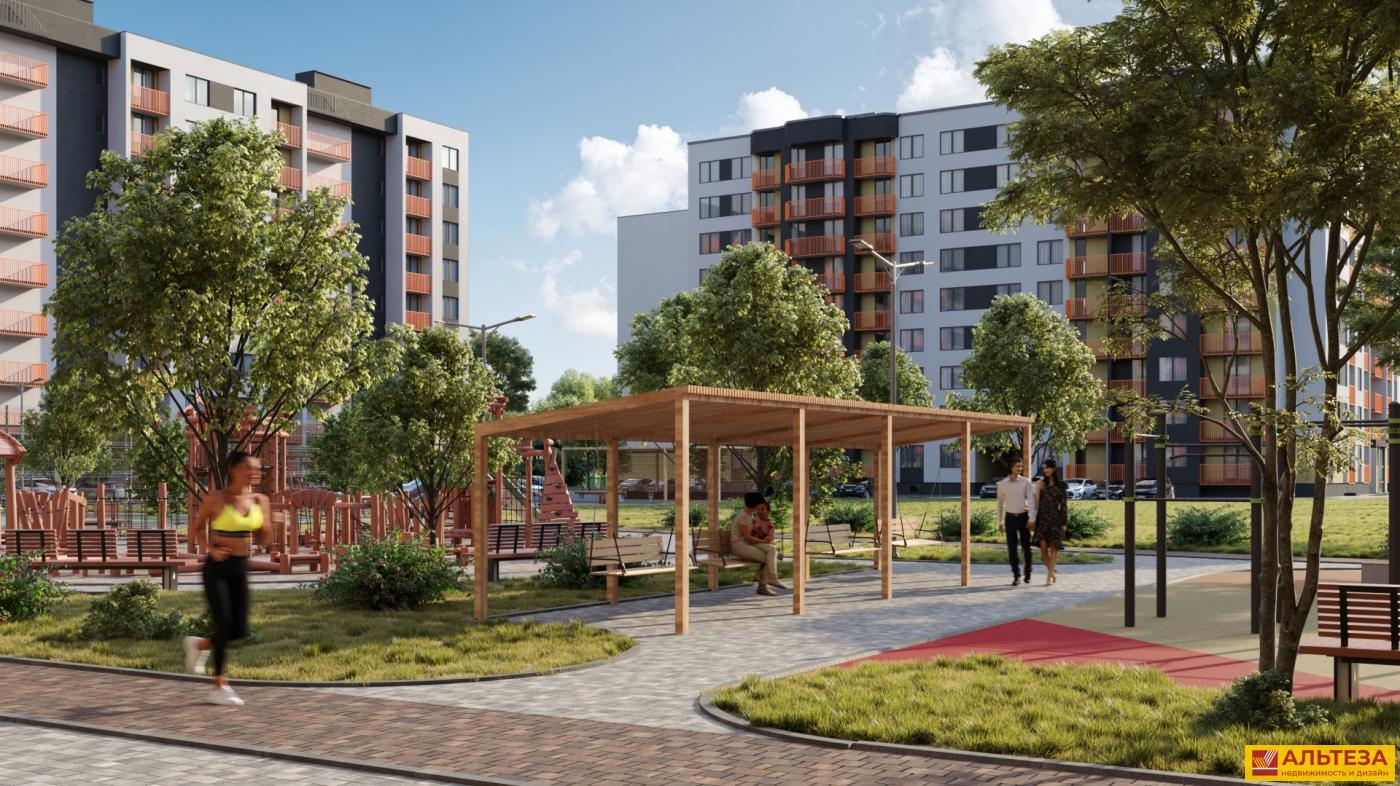 В центре комплекса расположен пруд, вокруг которого будет организована благоустроенная точка притяжения жителей всего комплекса, с большой детской и спортивной площадкой и зоной отдыха для взрослых.