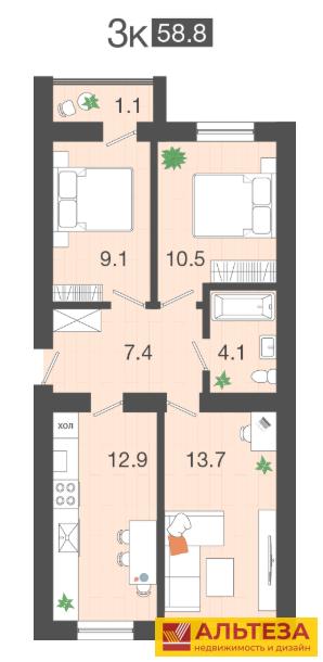 3-к.квартира, 58.8 м², 3/4 эт.
